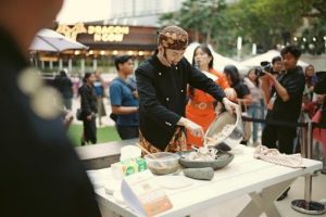Rafael Tan, pengusaha Seblak dan anggota boyband SMASH, melakukan demo memasak seblak di Celebrity Pop Up DXPO by Danamon 2024, Sabtu (20/07).