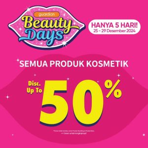 Sebagai wujud komitmen dalam menyediakan produk kecantikan terbaik, Guardian Indonesia menyelenggarakan Promo Beauty Days yang memberikan diskon hingga 50% untuk berbagai produk kosmetik dan kecantikan.