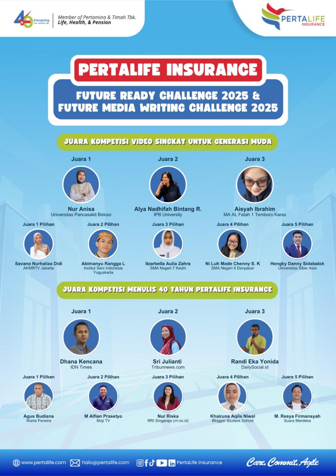 Future Ready Challenge 2025 merupakan kompetisi video pendek berbahasa Inggris yang mengusung tema “Your Life, Your Plan: Start Protecting What Matters”, sementara Future Media Writing Challenge 2025 adalah ajang lomba menulis reflektif dalam rangka HUT ke-40 PertaLife Insurance.